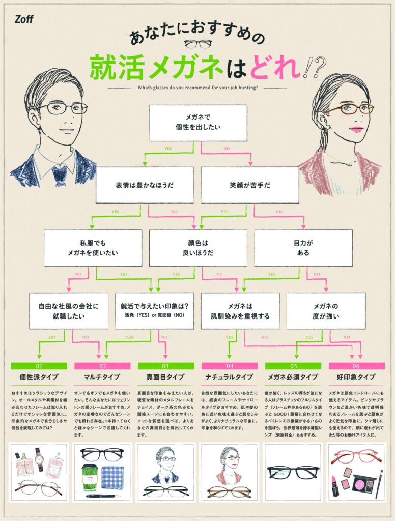 「あなたにおすすめの就活メガネはどれ!?」チャートに基づく、Zoffのおすすめメガネを紹介。