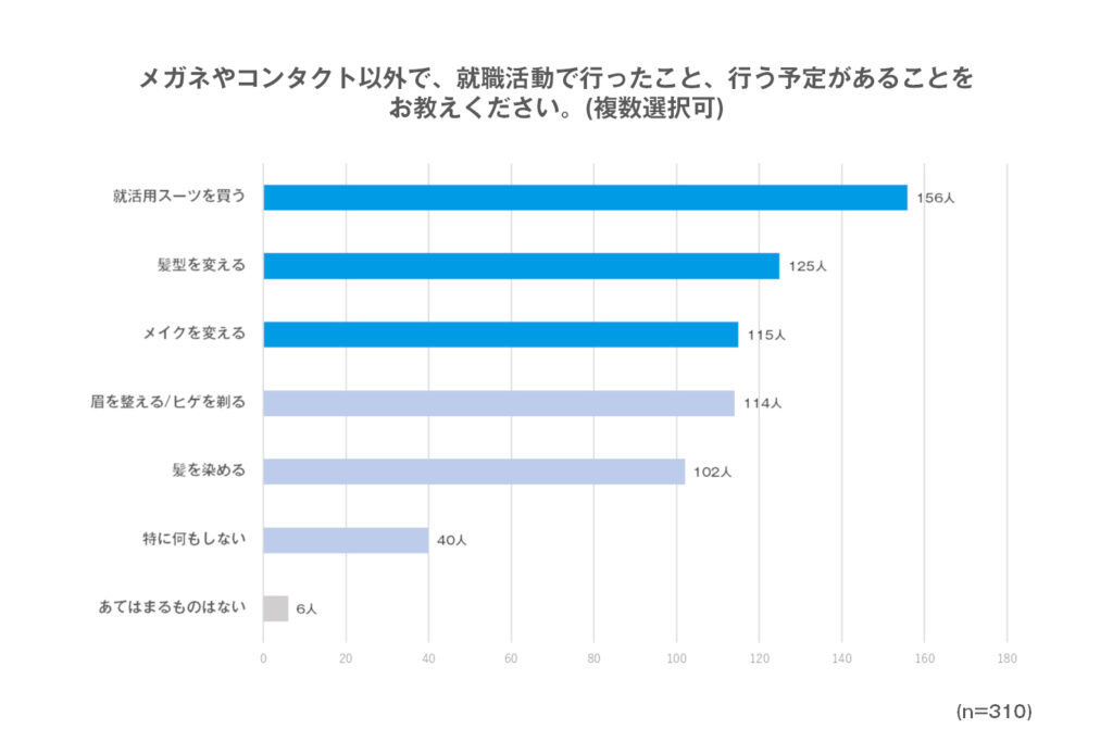 2018年にP&G社が端を発した「就活をもっと自由に」という広告をきっかけに没個性の就活が見直され始めている一方で、街中ではやはり今も昔も変わらず黒いスーツに黒髪の就職活動生を多く見かけます。「就職活動で行ったこと、行う予定があることを教えください」という質問では、「就職用スーツを買う」という意見が圧倒的に多く、次「髪型を変える」、「メイクを変える」などが続きます。「特に何もしない」と回答した人は40名に留まり、就職活動においては身だしなみを気にかけて容姿を変えていることがわかります。