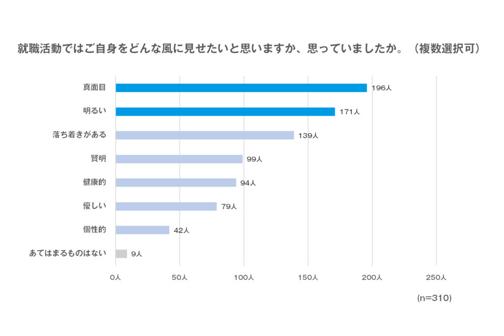 今後の就活では、自分らしさを表現する必要がより増していくのでしょうか。どんな風に見せたいかという質問では、真面目に次いで「明るい」を選ぶ人が多く、活発で元気な印象を表現したいと思っている人が多いのかもしれません。
