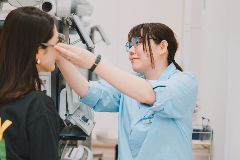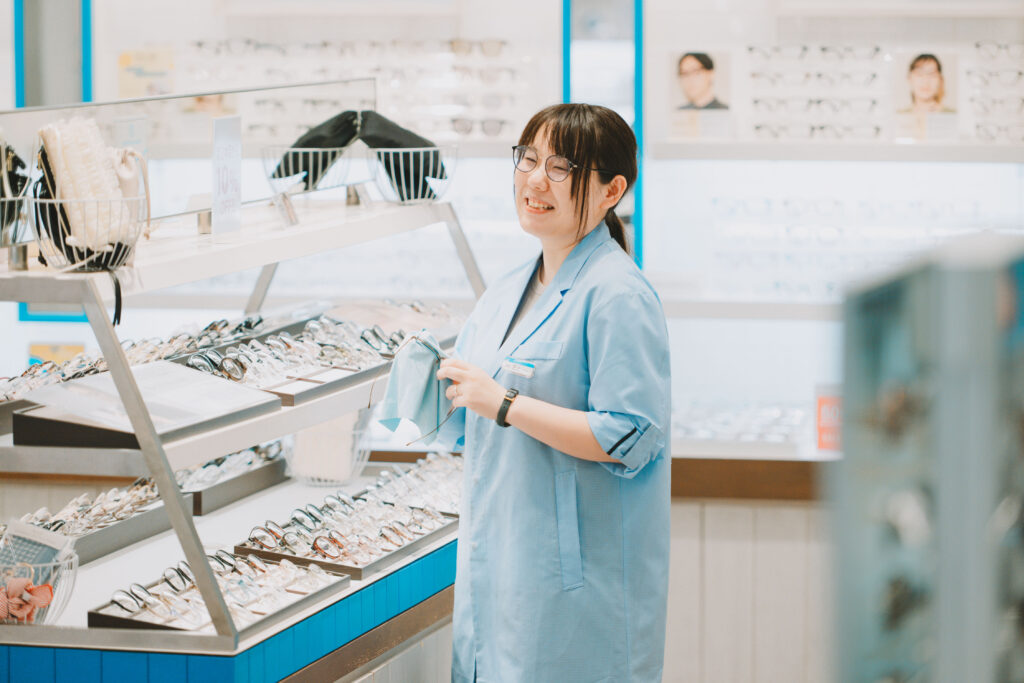 また、入社してから勉強すること自体も好きになり、2023年10月には国家検定資格である「2級眼鏡作製技能士」を取得しました。これは筆記による知識試験と、加工・測定・調整の実技試験があり、メガネ業界における基本的な技術と知識の証明となる資格です。この資格を取得したことで、スタッフへの指導にもより説得力をもって対応できますし、お客様へのご案内にも自信をもって、より丁寧にお応えできるようになったと感じています。