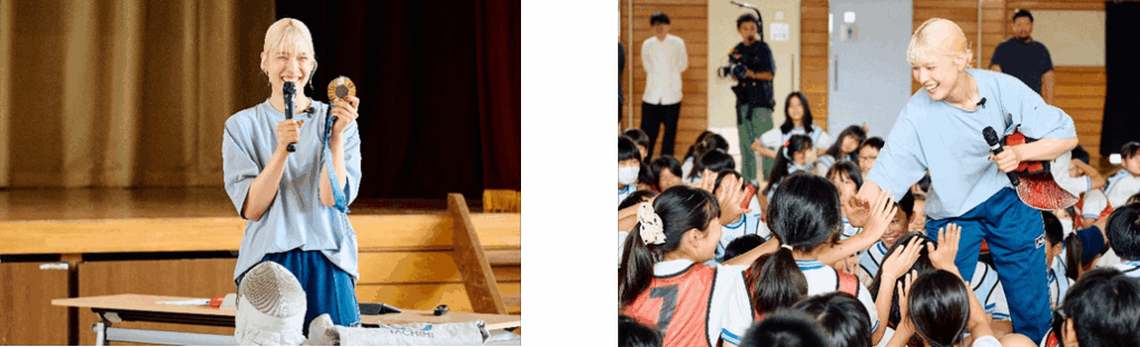 『授業の中で見せたフェンシングの道具やメダルにとても大きな反応をもらえたのが印象的でした。想像以上に喜んでもらえて、改めてフェンシングの魅力を伝える大切さを感じました。そして何より、子どもたちの笑顔やキラキラした目に私自身がたくさん元気をもらいました。とても貴重な時間を過ごさせていただきありがとうございました。』