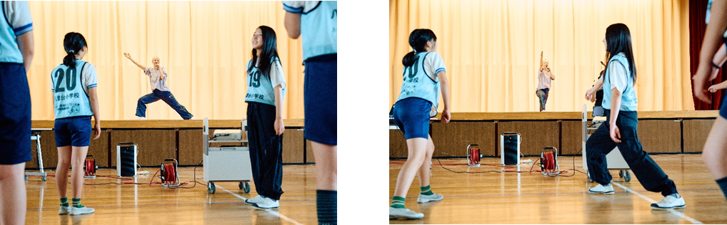江村美咲選手がステージ上でフットワークの見本を見せると、機敏な動きに児童たちは感嘆の声を上げていました。児童にとっては初めての体験で、特徴的なフットワークの動きに最初は苦戦した様子でしたが徐々にコツを掴み楽しみながらフェンシングの掛け声を発声しながら元気に参加していました。