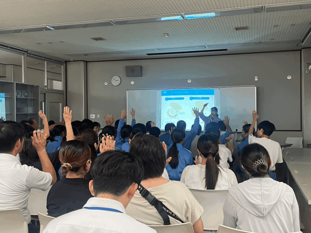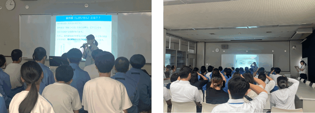 これまで目の健康について学ぶ機会はほとんどなかったため、生徒にとっても教職員にとっても、大変貴重な体験となりました。参加した生徒や教職員からは、「クイズが楽しかった」「アイケア体操が楽しかった」といった声が多く寄せられ、大変好評でした。授業の内容もわかりやすく、楽しく、そして参考になることばかりでした。今回の授業で学んだことを、今後の学校生活で取り入れていきたいと思います。ありがとうございました。