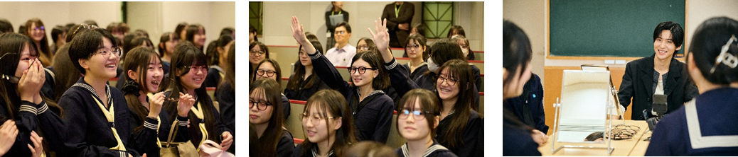 そしてこの記念すべき瞬間を見届けるために、Zoff のグローバルブランドアンバサダーである目黒蓮さんがサプライズで登場。生徒たちから大きな歓声が上がりました。目黒さんは「このような記念すべき日に立ち会えてとても光栄です。教職員の方々は生徒さんのことを考えてこの導入を決めたと思います。この大きな決断はとても素敵なことだと思いますし、たくさん検討を重ねられたのだと思います。僕自身も、Zoffのアンバサダーになって目の健康や目の紫外線対策について考えることが増えたので、紫外線から目の健康を守りたいという皆さんの想いに強く共感しています。今日の授業をきっかけに、改めて気をつけていきたいと思いました。」と語り、生徒たちと一緒に授業を受け、真剣に耳を傾ける姿が印象的でした。