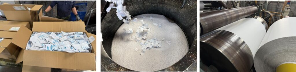 回収されたレンズ包装紙        水と攪拌し溶解する工程    リールに出来上がった再生紙を巻き取る